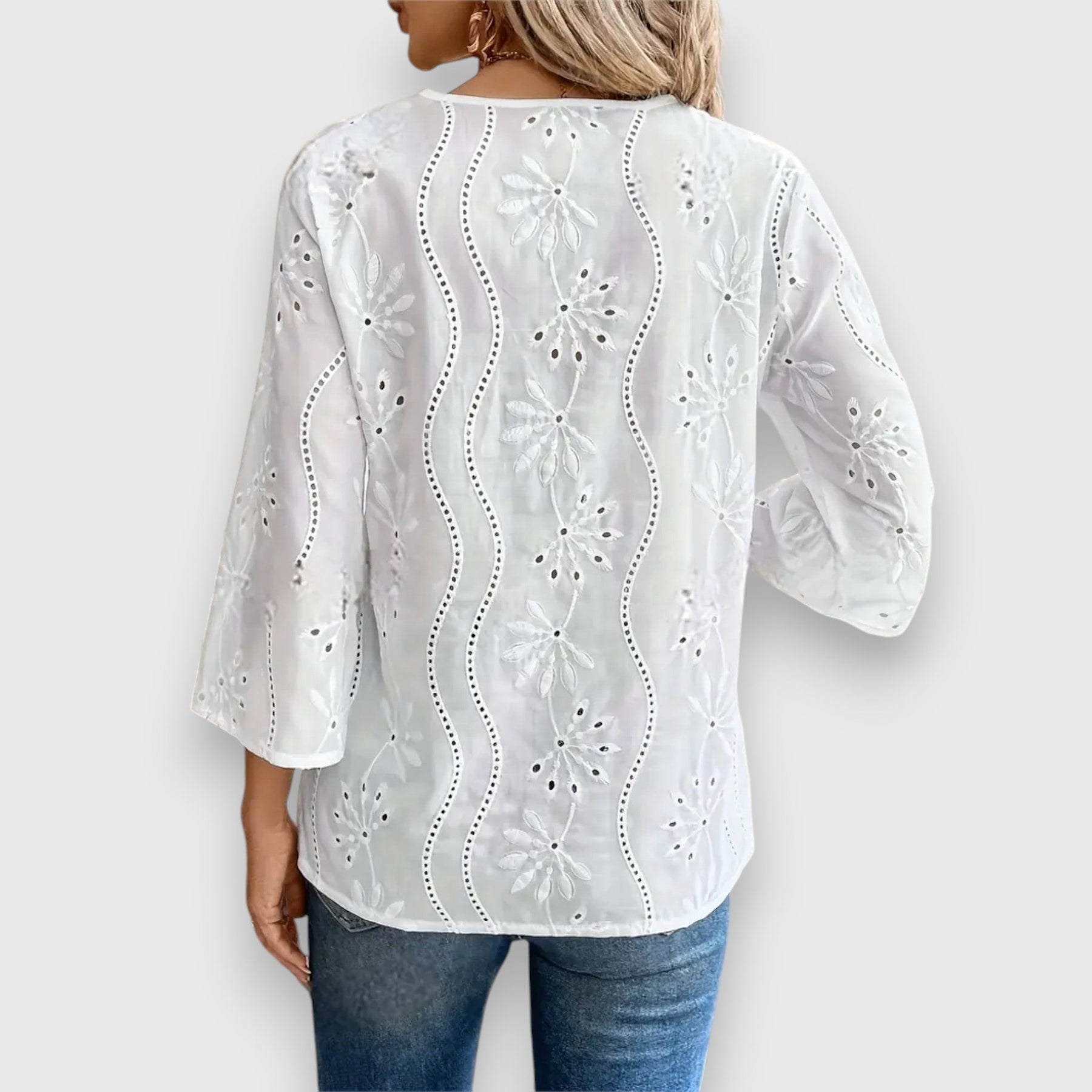 La blouse Tessa séduit par son élégant motif à œillets et sa longueur de manches 3/4 féminine, parfaite pour le printemps et l'automne. Son design classique et uni en fait un compagnon polyvalent pour diverses occasions – qu'elle soit portée de manière décontractée ou élégamment stylée.
