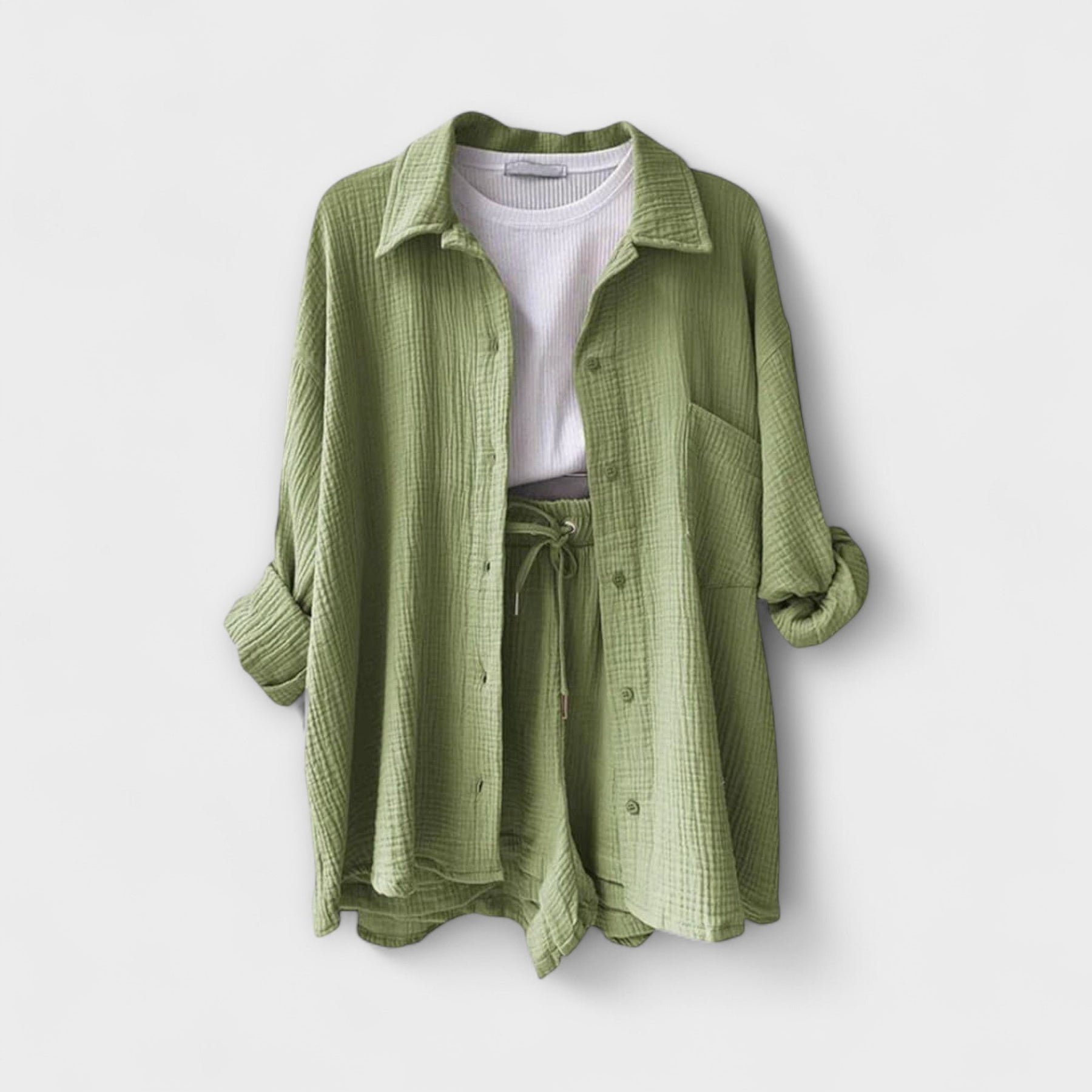 Victoria | Ensemble 2 pièces confortable est la combinaison parfaite de confort et de style pour ta garde-robe. Idéal pour les temps chauds, cet ensemble est fabriqué à partir de tissus respirants et d'un design élégant et polyvalent. Que tu te détendes au bord de la piscine ou que tu fasses une sortie décontractée, cet ensemble offre une coupe flatteuse qui te garde au frais et en confiance toute la journée.